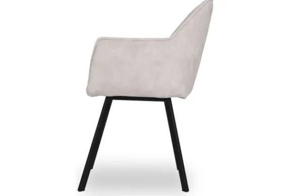 Eetkamerstoel Jolien van het merk Donc heeft zwart metalen poten en een rugleuning die rondom loopt en overgaat in armleuningen. De stoel oogt comfortabel en heeft een rustige moderne uitstraling.