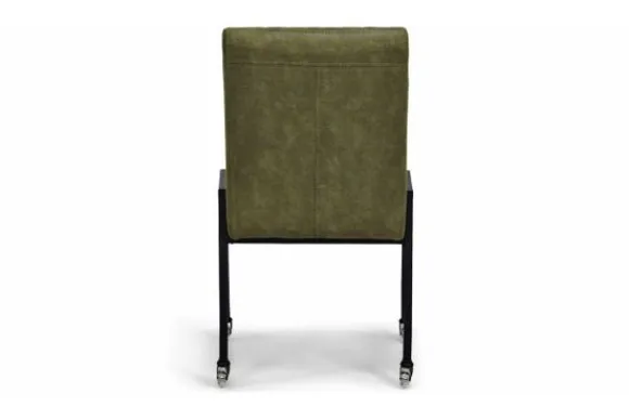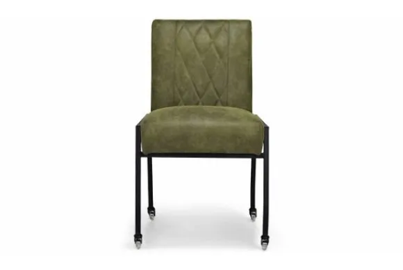 Deze eetkamerstoel wordt uitgevoerd met een ruitstiksel gestikt in een kader en met metalen poten met skatewieltjes.