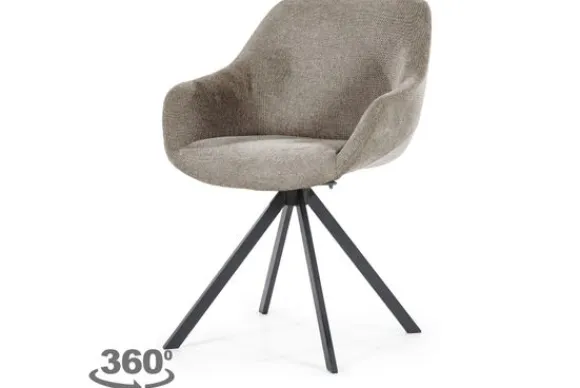 Eetkamerstoel Mamé bruin Houston 95838 van het merk Eleonora is beschikbaar in drie verschillende kleuren: beige, bruin en grijs. Deze stoel is bekleed met een stof die je kunt schoonmaken met de stofzuiger. Deze stoel is door de zwart metalen stervoet 360 graden draaibaar. De rugleuning van de stoel loopt in een vloeiende beweging over tot armleuningen.