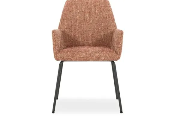 Het ranke onderstel in gecoat zwart metaal vormt een stijlvol contrast en geeft de stoel een moderne, luchtige uitstraling. De hoge rugleuning en zacht gestoffeerde armleuningen zorgen voor een comfortabele, ondersteunende zitbeleving die uitnodigt tot tafelen in stijl.