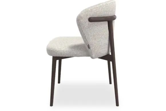 De poten van essenhout brengen een warme, natuurlijke basis in het ontwerp. Het design kenmerkt zich door elegante, gebogen lijnen bij de rugleuning die naadloos overgaan in de armleuningen, wat een moderne uitstraling geeft.