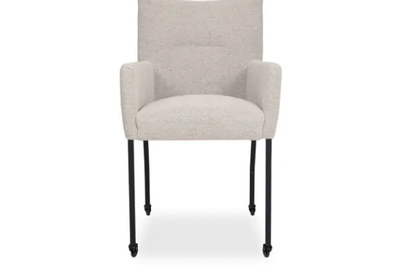 Eetkamerstoel Carina van het merk France in alle kleuren en in verschillende materiaalsoorten zoals stof, velvet en microvezel. De stoel biedt extra comfort vanwege de armleuningen. Het horizontale stiksel in de rug en de strakke vormgeving geeft de stoel een moderne uitstraling. De eetkamerstoel wordt geleverd met zwarte metalen poten met wieltjes.