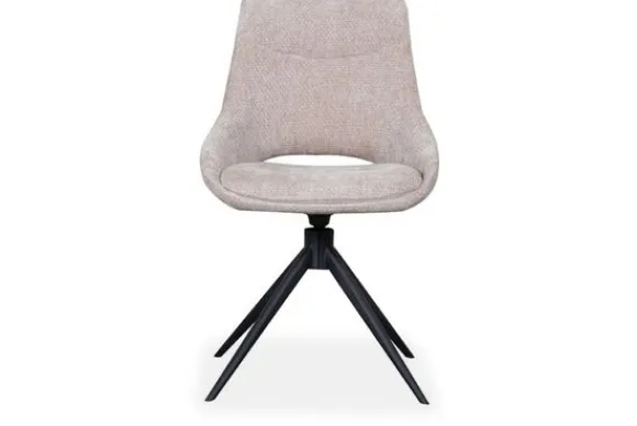 De stoel is ontworpen met een gebogen rugleuning die goede ondersteuning biedt tijdens lange diners. De brede zitting zit comfortabel en de draaifunctie met auto return maakt het aanschuiven extra makkelijk. De slanke metalen poten zorgen voor een stabiele basis en een moderne uitstraling.
