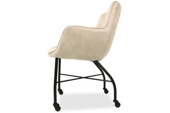 De eetstoel heeft verticale en horizontale stiksels in de rugleuning lopen, wat voor een mooi ontwerp zorgt. De stoel heeft armleuningen wat voor een comfortabele zit en goede ondersteuning zorgt. Deze eetkamerstoel heeft zwart metalen poten en wieltjes, waardoor de stoel gemakkelijk te schuiven is.