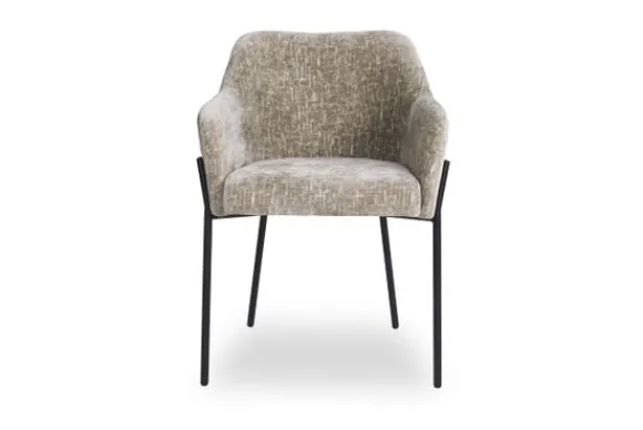 Eetkamerstoel Fay 211211 Shitake Island van het merk Richmond Interiors is gestoffeerd met de stof Island 124 Shitake. Deze stof heeft een chique uitstraling en een zachte vleug. De rugleuning loopt vloeiend over in armleuningen. Het onderstel is gemaakt van metaal, in de kleur zwart.