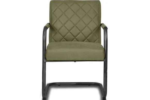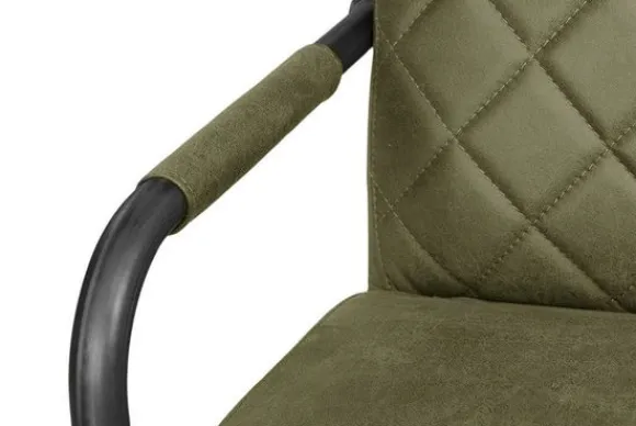 Eetkamerstoel Civo NI 0340 Groen van het merk Tower Living is beschikbaar in drie kleuren: antraciet, cognac en groen. Deze stoel is bekleed met de Bull 59 en heeft zwart metalen poten. De poten lopen door tot armleuningen die voor een deel bekleed zijn. In de rugleuning zit een wieberstiksel en de zitting is glad.