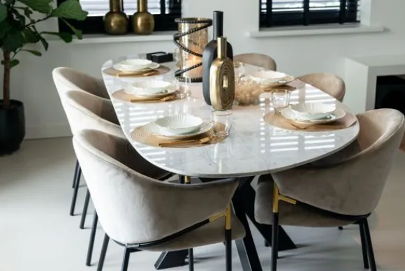 Eetkamerstoel Jocasta S4578 Khaki Velvet van het merk Richmond Interiors is een set van 2. De stoelen zijn gestoffeerd met Quartz Khaki 903 en hebben metaal zwarte poten met aan de bovenkant een chique messing detail. De rugleuning loopt geleidelijk over in armleuningen.