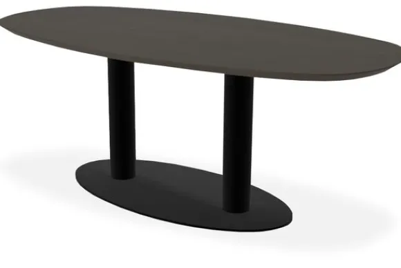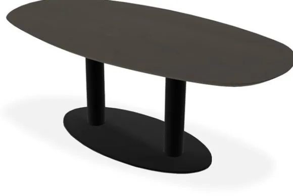 Eettafel Dane van het merk De Houtmaatschappij combineert kracht en elegantie in een opvallend ontwerp. Het blad is gemaakt van eikenhout en is 4 cm dik, waarvan 2 cm opgedikt bij de maten van 180 cm tot en met 260 cm. Bij de maten 160 cm, 280 cm en 300 cm is het blad volledig 4 cm dik. De afgeronde stomp ovale vorm geeft de tafel een zachte en moderne uitstraling, terwijl de donkere houtkleur voor diepte en warmte zorgt.