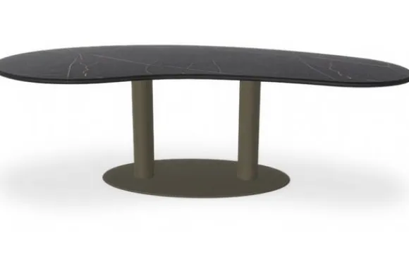 Eettafel Nuvio van het merk Every Table BV heeft een organisch gevormd HPL blad van 2,8 centimeter dik. Het blad is verkrijgbaar in verschillende maten en wordt standaard geleverd met een ronde rand.