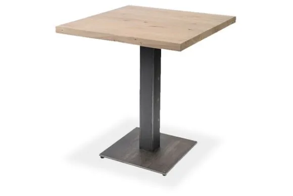 Deze eettafel wordt standaard uitgevoerd met een 5 cm eiken blad waarvan 2,5 cm massief en 2,5 cm opgedikt. De tafel is voorzien van een metalen poot in de kleur rustiek/blauwstaal.