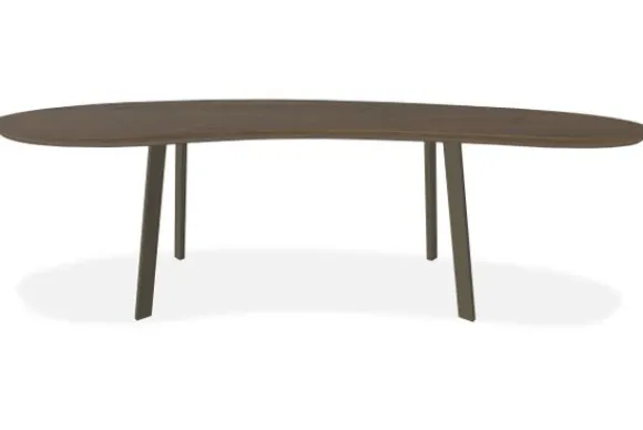 Eettafel Alvin van het merk De Houtmaatschappij heeft een organische vorm met een 2+2 cm opgedikt blad, waardoor de poot mooi in het blad valt en de randen stevig ogen.