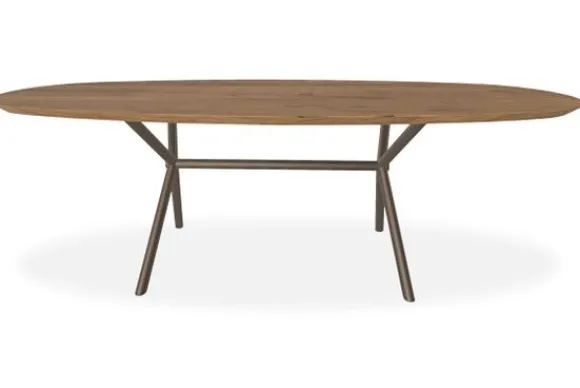 Eettafel Alvin van het merk De Houtmaatschappij heeft een stomp ovale vorm met een 2+2 cm opgedikt blad, waardoor de poot stevig in het blad valt en de randen een dikkere afwerking krijgen. De afmetingen 160 cm, 280 cm en 300 cm hebben een volledig massief blad van 4 cm dik.