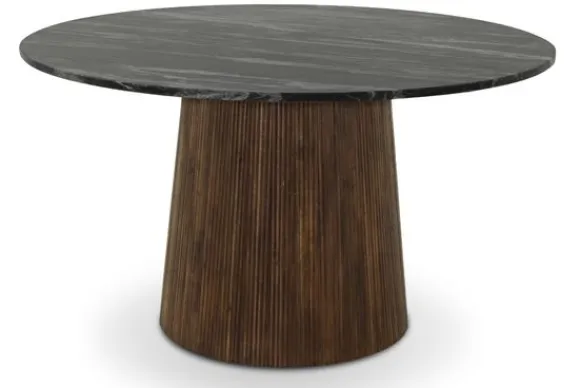 Eettafel Maxim 95637 van het merk Eleonora heeft een poot gemaakt van mangohout waarin je allemaal verticale latjes ziet. Het tafelblad is rond en gemaakt van marmer. Onder de Maxim meubelserie vind je ook tafels in andere formaten.