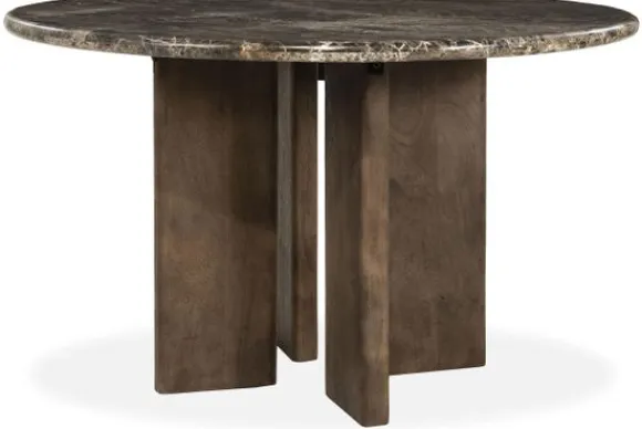 Het blad rust op een robuust onderstel van mangohout. De combinatie van marmer en hout zorgt voor een prachtige balans tussen luxe en natuurlijkheid.