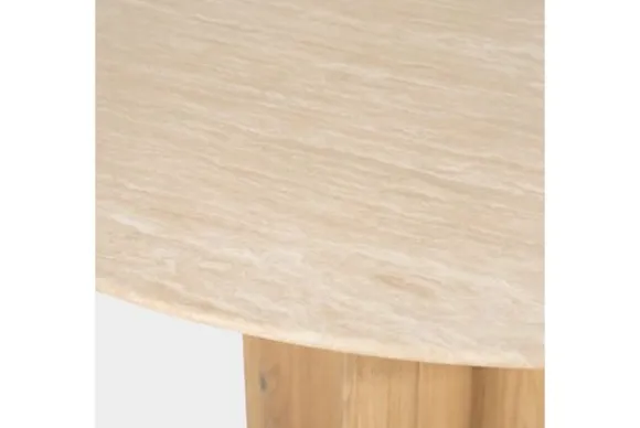Eettafel Lova 96598 van het merk Eleonora is uitgevoerd met een rond blad van travertin en een onderstel van eikenhout. Het blad heeft een lichte kleur met een zichtbare steenstructuur. De ronde vorm zorgt voor een gelijkmatige verdeling van de ruimte rondom de tafel. Het onderstel bestaat uit meerdere eiken delen die elkaar kruisen in het midden. Dit zorgt voor een stevige en stabiele constructie.