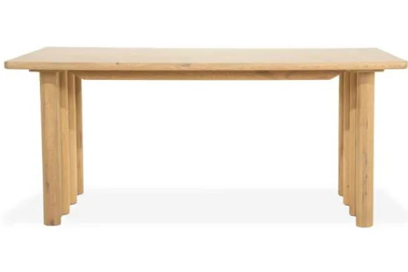 Het tafelblad is gemaakt van eikenhout en eiken fineer met een duidelijke nerfstructuur. De naturel afwerking laat het hout goed tot zijn recht komen. Het onderstel bestaat uit verticale lamellen die samen stevige tafelpoten vormen en zorgen voor een stabiele basis.