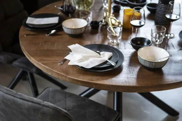 Eettafel Ruth van het merk Eleonora is gemaakt van mangohout. Mangohout kun je herkennen aan de vele kleurschakeringen en ongelijkheden in het oppervlakte van het hout, waardoor geen enkel meubelstuk hetzelfde is. Mangohout is een duurzame houtsoort, heeft een fijne nerf en is uniek, omdat elk stuk er net iets anders uitziet. Deze tafel heeft een rond blad met in het midden een spinpoot, hierdoor kun je overal rondom de tafel jouw eetstoelen kwijt.