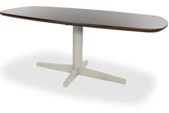 Eettafel Libra van het merk MySons is een Deens ovale eettafel van mangohout. Het blad heeft een warme bruine kleur en een duidelijke houtstructuur. De tafel staat op een centrale poot met een kruisvormige voet in een beige kleur. Dit zorgt voor een stabiele basis en veel beenruimte rondom de tafel. De vorm maakt de tafel geschikt voor een Japandi of modern interieur.