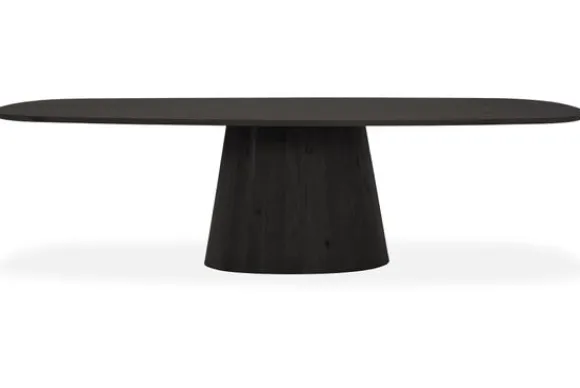 Eettafel Hedera van het merk Premium Interior is een stomp ovale tafel met een houten blad en een brede houten middenpoot.