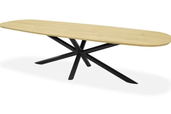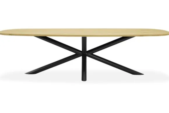 Eettafel Torvic van het merk Premium Interior is een stomp ovale tafel met een houten blad en een metalen spinpoot.