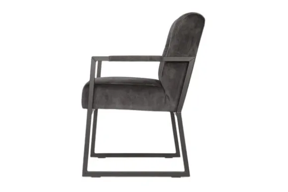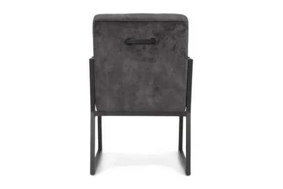 Eetkamerstoel Bullock van het merk Donc is beschikbaar in alle kleuren en in diverse materiaalsoorten zoals stof, kunstleder en rundleder. Deze eetkamerstoel is voorzien van zwart metalen poten, een blokstiksel in de rugleuning en heeft armleuningen. Deze armleuningen zijn voor een deel bekleed voor een comfortabel gevoel aan de armen. De Bullock is ook beschikbaar met andere stiksels in de rug en zonder armleuningen. Deze stoel heeft een simpel, elegant design. Deze stoel wordt standaard uitgevoerd met een handgreep achter op de rugleuning, je kunt deze ook weglaten.