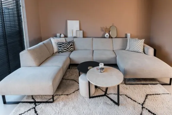 Bij dit bankstel zijn een koppelbare houten tafel en een hocker optioneel.