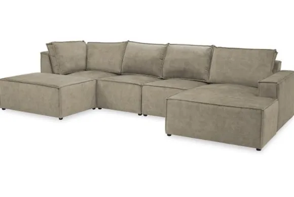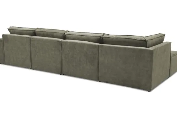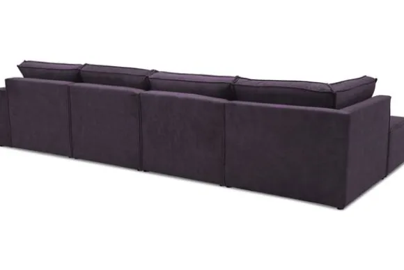 Dit bankstel is zelf samen te stellen in vele afmetingen en elementen, of je kunt gaan voor een van de standaard opstellingen. Deze opstelling is uitgerust met een speelse poef.