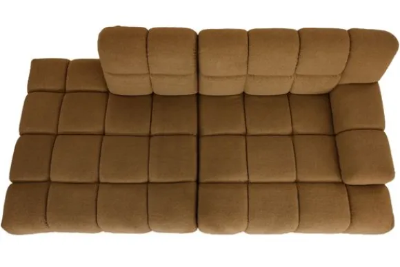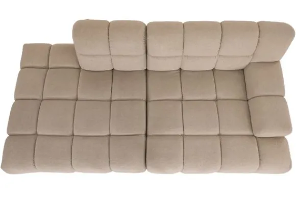 Bankstel Trentino van het merk Moderno is een bank met geblokte zit- en rugkussens en een zitting die doorloopt tot net boven de grond.