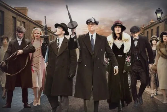 Glasschilderij Criminele bende 080120C-744 van het merk Ter Halle toont verschillende personages uit de serie Peaky Blinders. De stijlvol geklede figuren in het straatbeeld hebben een vastberaden houding en creëren een dramatische, stoer uitziende scène.