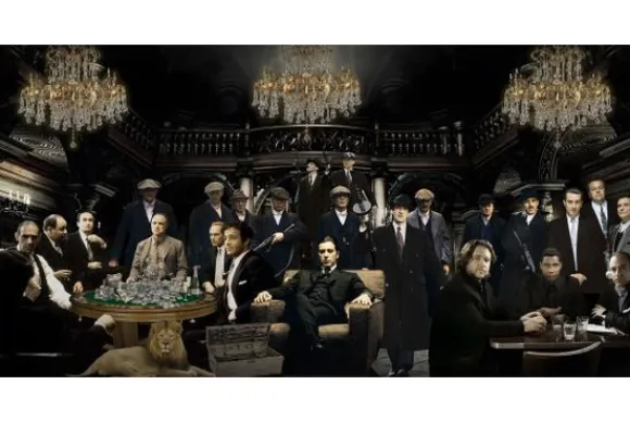 De scène wordt gedomineerd door filmsterren in klassieke maffia-uitrusting, zoals donkere pakken, overjassen, en fedora-hoeden. Een imposante leeuw en een wapenkist zijn opvallende elementen in de afbeelding en voegen een gevoel van dreiging en dominantie toe.