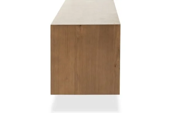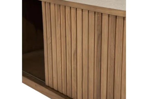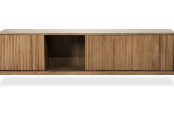 Achter de schuifdeuren bevindt zich gesloten opbergruimte voor apparatuur en kabels. Het open vak aan de rechterzijde is geschikt voor een mediaspeler of accessoires.