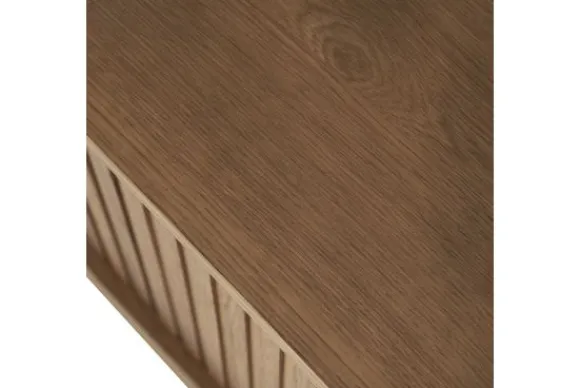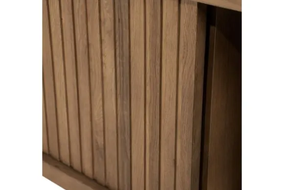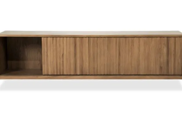 Het hangend tv-meubel is gemaakt van eikenhout en eiken fineer in een bruine uitvoering. De houtstructuur blijft zichtbaar en geeft het meubel een natuurlijke uitstraling. De schuifdeuren zijn voorzien van verticale groeven en zorgen voor een strak front.