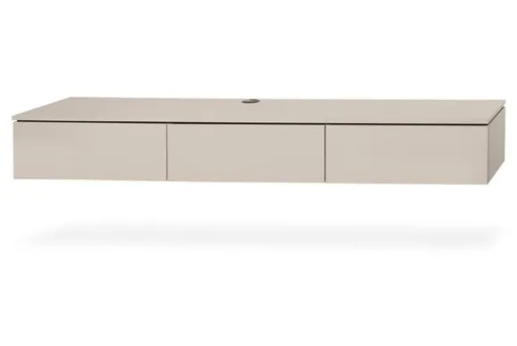 Het tv-meubel is voorzien van greeploze klepdeuren met daarachter ruime opbergvakken voor apparatuur, kabels en accessoires. Het geïntegreerde kabelmanagement zorgt voor een opgeruimd geheel. Dit model kan hangend worden gemonteerd, maar is ook te plaatsen op de vloer met een optionele afdekplint, waardoor het meubel flexibel toepasbaar is.