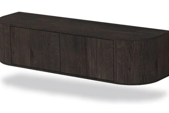 Hangend tv-meubel Novero van het merk Livingfurn is een wandmeubel met afgeronde vormen en een donkere houtkleur. Door het zwevende ontwerp blijft de vloer vrij, wat zorgt voor een open indeling en praktisch bij stofzuigen.