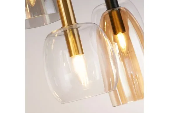Hanglamp Divine 36463-6BK van het merk Searchlight heeft zes lichtbronnen die aan een ovalen plafondkap hangen. De verschillende glazen lampenkappen creëren een warme, gezellige sfeer.