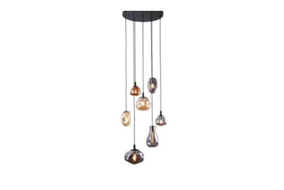 Hanglamp Airmelt 7-lichts van het merk Toms Luxury Lights is een 7-lichts hanglamp. Door het zwarte staal in combinatie met het met het glas krijgt deze lamp een stoere en industriële uitstraling. De lichtbronnen zijn verstelbaar naar wens. Hierdoor kun je een speels effect creëeren. Het glas zorgt voor een bijzondere lichtinval dat de ruimte laat stralen. De lamp is voorzien van 7 x een E27 (grote) fitting en heeft een maximale wattage van 25 Watt. De hanglamp is dimbaar middels een externe dimmer en een dimbare lichtbron. De lamp wordt geleverd inclusief lichtbron.