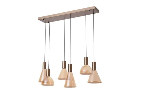 Hanglamp Cannes van het merk Searchlight is een moderne designlamp die kunstzinnige flair en praktische verlichting combineert. Het armatuur bestaat uit zes hanglampen met afwisselend kegel- en koepelvormige glazen kappen in een warme amberkleur, wat zorgt voor een speels en stijlvol lijnenspel.