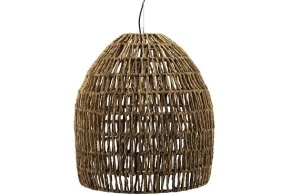 De handgeweven structuur vormt een open, luchtige kap die een subtiel spel van licht en schaduw creëert. De warme, bruine kleur van het vlechtwerk voegt een aards en stijlvol tintje toe, terwijl de organische vorm zorgt voor een zachte en uitnodigende uitstraling.