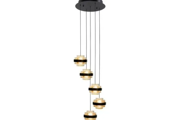Hanglamp Dynasty Champagne Glas van het merk Highlights heeft vijf lampen met glazen lampenkappen. Deze vijf lampen zijn verstelbaar in lengte. De maximale lengte is 160 cm. De lampen kunnen op verschillende hoogtes gehangen worden, hiermee creëer je een speels effect. De luchtbellen in het glas geven de lamp zijn unieke uitstraling. Vanwege het glas heb je naast sfeervol zijwaarts licht ook goed licht dat naar beneden schijnt. Deze hanglamp heeft een ronde, matzwarte plafondbevestiging. De Dynasty serie bestaat uit hanglampen, een tafellamp en een wandlamp. Deze zijn er zowel in helder- als champagnekleurig glas. Maak je interieur helemaal af met de complete serie.