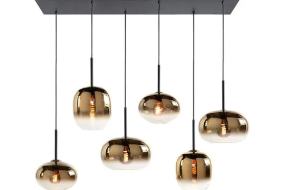 Hanglamp Bellini van het merk Highlight heeft zes goudkleurige glazen lampenkappen van verschillende formaten. Deze zes lampen zijn verstelbaar in lengte. De maximale lengte is 130 cm. De lampen kunnen op verschillende hoogtes gehangen worden, waardoor je een speels effect creeërt. De Bellini serie bestaat uit een tafellamp, een vloerlamp en hanglampen. Deze zijn er zowel in rookkleurig glas als in goudkleurig glas. Maak je interieur helemaal af met de complete serie.