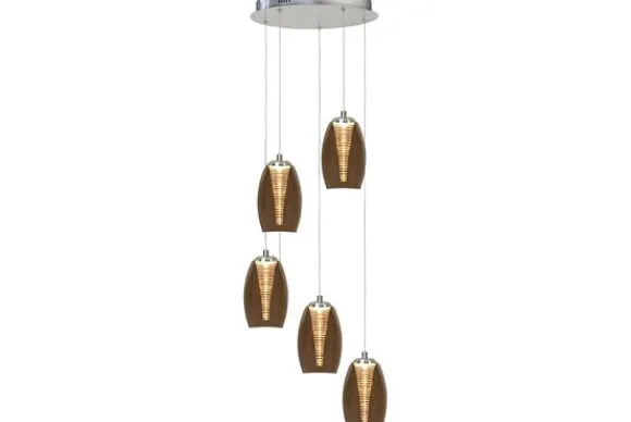 Hanglamp Nebula van het merk Highlights heeft 5 lampen met amber glazen lampenkappen. Deze 5 lampen zijn verstelbaar in lengte, de maximale lengte is 170 cm. De lampen kunnen ook op verschillende lengtes gehangen worden, waardoor je een speels effect creeërt. De serie Nebula bestaat uit een hanglamp, plafondlamp, wandlamp en tafellamp, zowel in amber glas als in smoke glas. Maak je interieur compleet met deze serie!