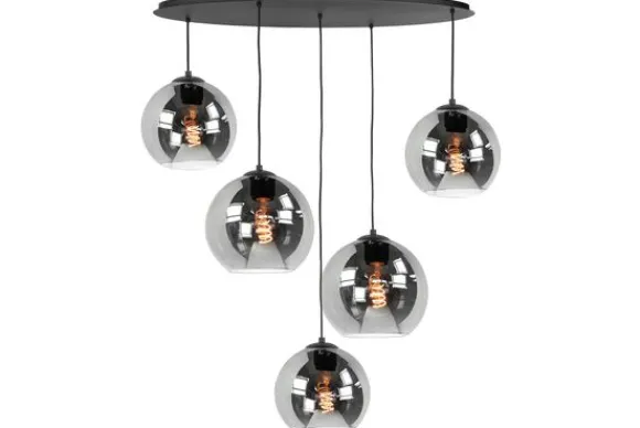 Hanglamp Fantasy Ovaal van het merk Highlight heeft vijf zwarte glazen lampenkappen van verschillende formaten. Deze vijf lampen zijn verstelbaar in lengte. De maximale lengte is 130 cm. De lampen kunnen op verschillende hoogtes gehangen worden, waardoor je een speels effect creeërt. De Fantasy serie bestaat uit plafondlampen, een tafellamp, wandlamp en vloerlamp. Deze zijn er in semi-rookglas, rookglas of amberglas. Maak je interieur helemaal af met de complete serie.