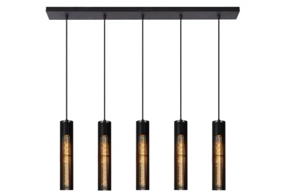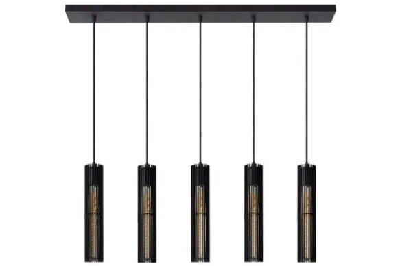 Hanglamp Lionel van het merk Lucide is een stijlvolle verschijning met een moderne industriële uitstraling. De vijf slanke, cilindervormige kappen van zwart metaal zijn voorzien van fijne lamellen die het licht op een sfeervolle manier filteren. Het ontwerp combineert elegantie met stoer karakter en voegt diepte en warmte toe aan elke ruimte.