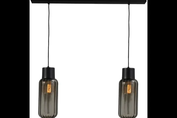 Hanglamp 2156-05-05-100-2 uit de Lett Rib serie van het merk Masterlight heeft twee lampen onder donkere glazen lampenkappen. Doordat de lichtbron niet meegeleverd is, kun je zelf helemaal bepalen hoeveel licht je wilt en in welke kleur. De maximale wattage is 2 keer 75 watt en de lamp heeft een E27 fitting. De lamp is dimbaar via een exlusieve externe dimmer in combinatie met een compitabele lichtbron.