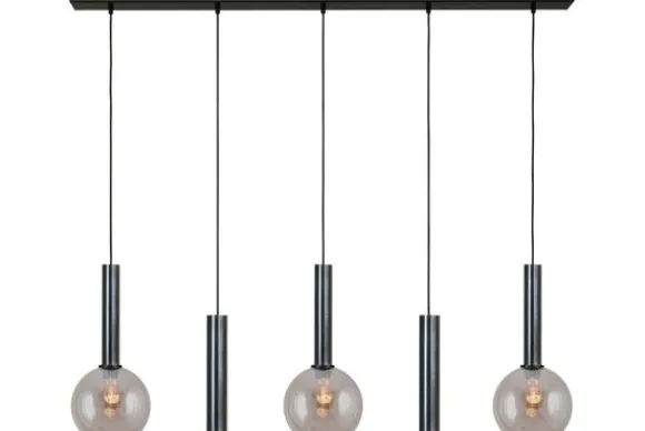 Hanglamp 2982-05-35-3-05-225 Bella van het merk Masterlight is een klassieke en sierlijke lamp. De hanglamp heeft drie lampenkappen die gemaakt zijn van goud fuméekleurig glas en twee smalle dappled oilkleurige lampenkappen. Fuméeglas is getint glas met een kleurverloop. Door het kleurverloop krijgt het licht in je ruimte een sfeervolle en intieme uitstraling. De klassieke lamp combineert mooi met de zwarte metalen afwerking en komt goed tot zijn recht in verschillende soorten ruimtes. Hang de hanglamp boven je eettafel, salontafel of in de hal. De drie glazen lampenkappen hebben een E27 fitting en de twee smalle lampenkappen hebben een GU10 fitting. De hanglamp wordt zonder lichtbron geleverd. Maak de lamp compleet door in de winkelmand je lichtbron toe te voegen.