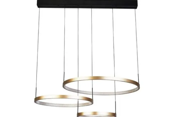 Hanglamp 20227-3GO Grace LED multi pendant van het merk Searchlight is een chique lamp met drie grouden ringen die aan een zwarte plafondbalk hangen. Binnenin de ringen zit LED-verlichting. Deze lamp is dimbaar.