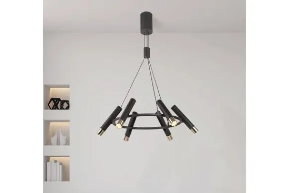 Hanglamp Cylinder 31651-6BK van het merk Searchlight is een zeslichts hanglamp. De lamp is gemaakt van metaal in de kleur zwart en het uiteinde van de lampfittingen zijn goudkleurig. De lamp is voorzien van LED-lichtbronnen. Deze stijlvolle hanglamp is in hoogte verstelbaar en dimbaar door middel van een externe dimmer en bijpassende lichtbron.