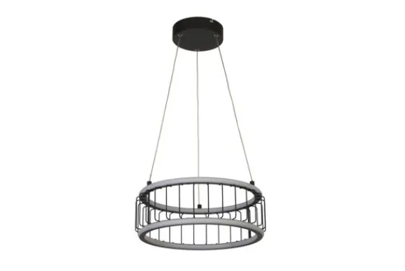 Hanglamp Circolo Cage 54213-1BK van het merk Searchlight is een strakke, industriële hanglamp. De lamp bestaat uit twee concentrische cirkels van LED-lampen verbonden door matzwarte metalen staven. Ze zijn opgehangen aan een zwarte ronde plafondplaat.