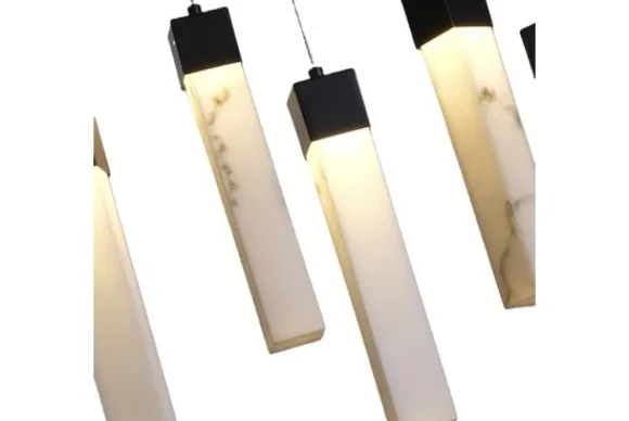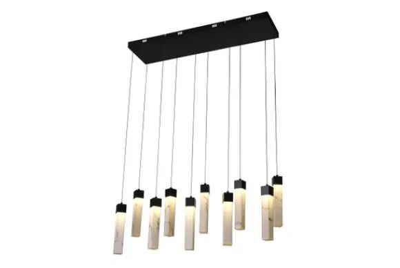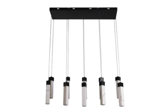 Hanglamp Moonbeam van het merk Searchlight brengt moderne vormgeving samen met een warme, stijlvolle sfeer. De lamp bestaat uit tien slanke lichtbronnen van hoogwaardig kunsthars met een verfijnde marmerlook, die aan een matzwarte metalen plafondplaat hangen. Het resultaat is een indrukwekkend lichtspel dat elke eetkamer of woonkamer een stijlvolle, eigentijdse sfeer geeft.