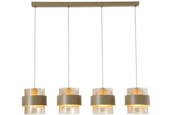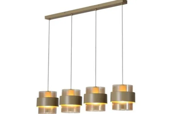 De vier cilindervormige lampenkappen zijn vervaardigd uit helder glas met een fijn geribbeld patroon en een stalen omlijsting. Ze hangen op gelijke hoogte, wat zorgt voor een strak lijnenspel boven een eettafel of kookeiland. Deze lamp is echter ook in hoogte verstelbaar.